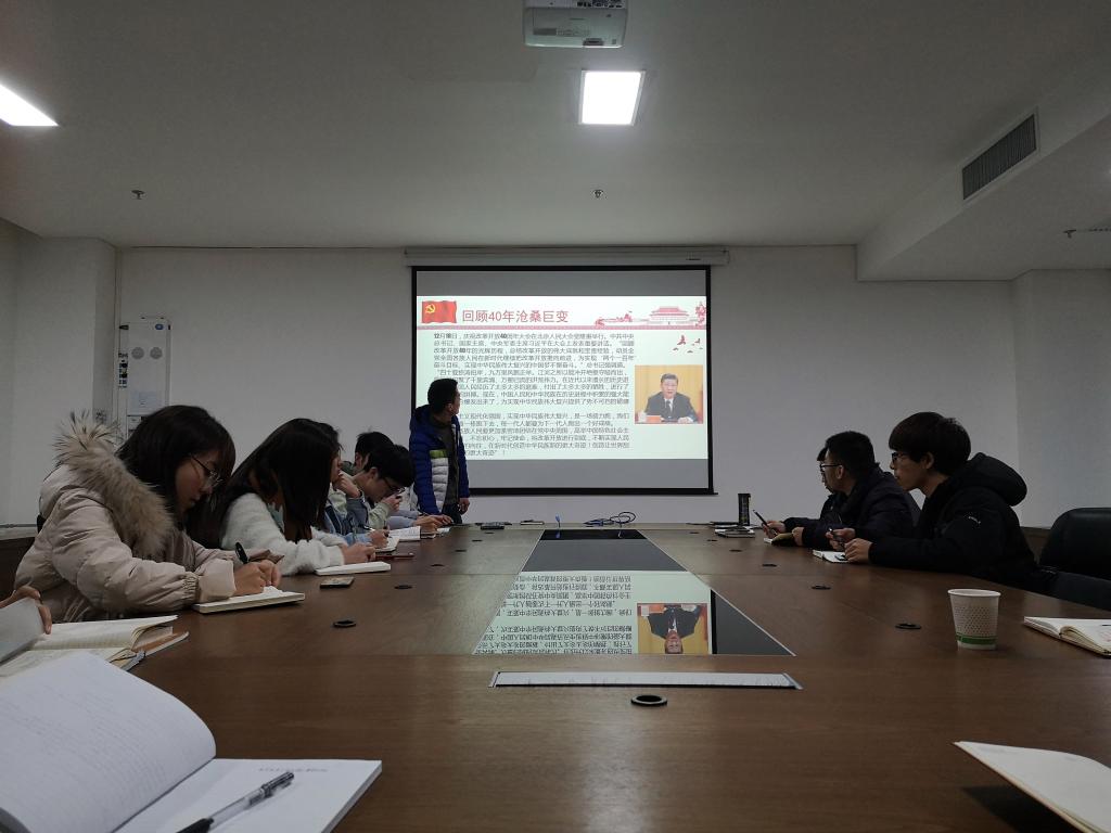 硕8018+8020班党支部在仲英第二会议室召开党日活动。会议由支部书记王普强、张高同志、支部委员朱波、李臻同志共同主持,支部共15人参加。本次会议特别邀请了孙巧艳教授与会指导。会议的主题为“纪念改革开放四十周年”。