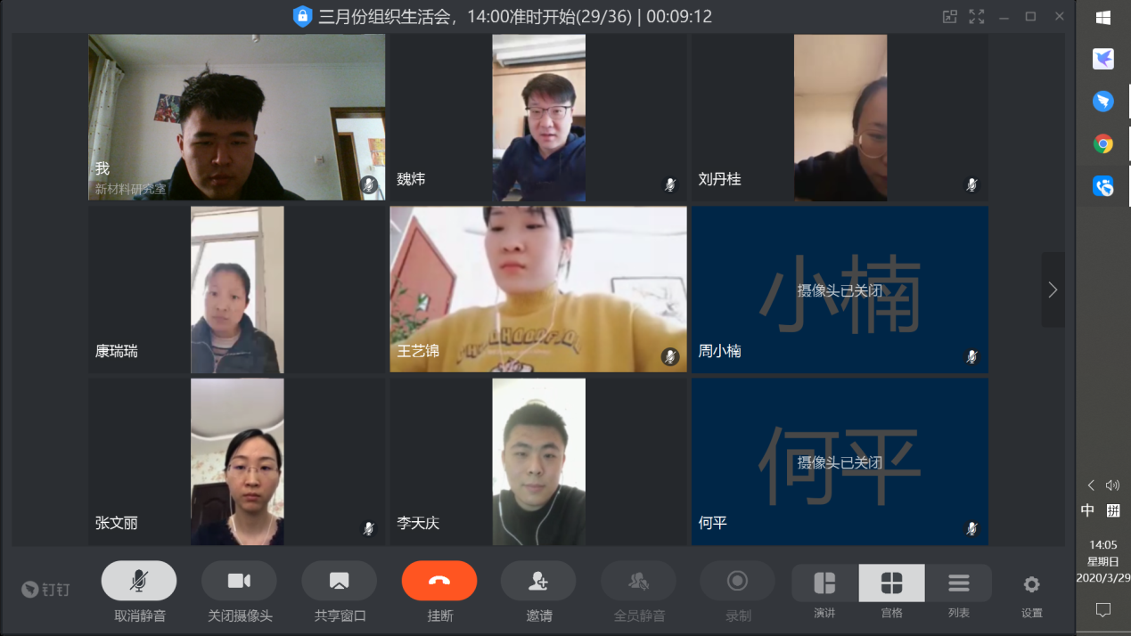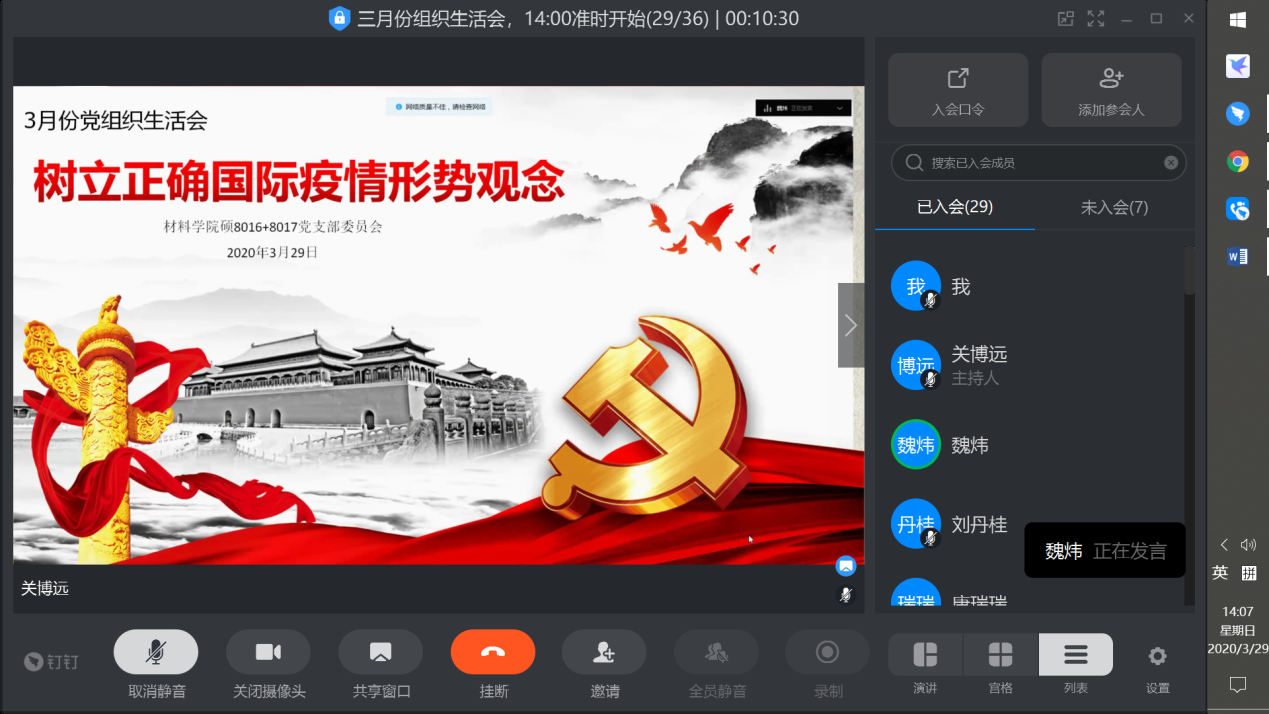 防疫工作、创新港建设等的新进展,并且了解了支部成员的居家情况以及困难。臧绪丰、李天庆、代晓涵等党员同志分享了自己在家中的工作与收获。魏老师提出,居家期间不仅要继续注意疫情防控,陪伴家人,还要主动联系导师,积极做好开学准备,不放松学业。