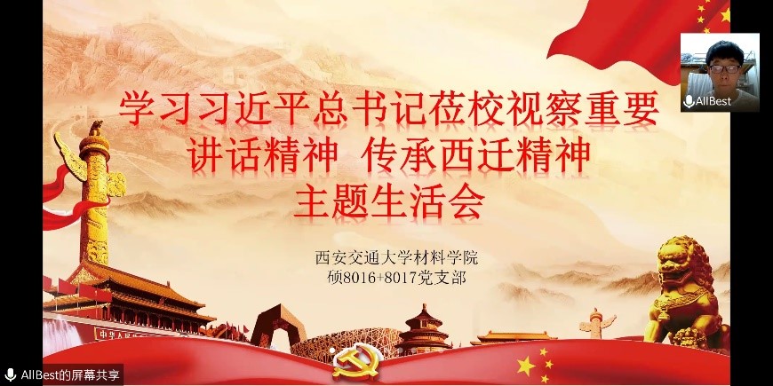 硕8016+8017党支部在腾讯会议召开主题为“学习习近平总书记莅校视察重要讲话精神 传承西迁精神”的党支部生活会。会议由支部成员胡永宝同志主持,支部共27人参加。会议特邀请黄小燕老师与会指导。