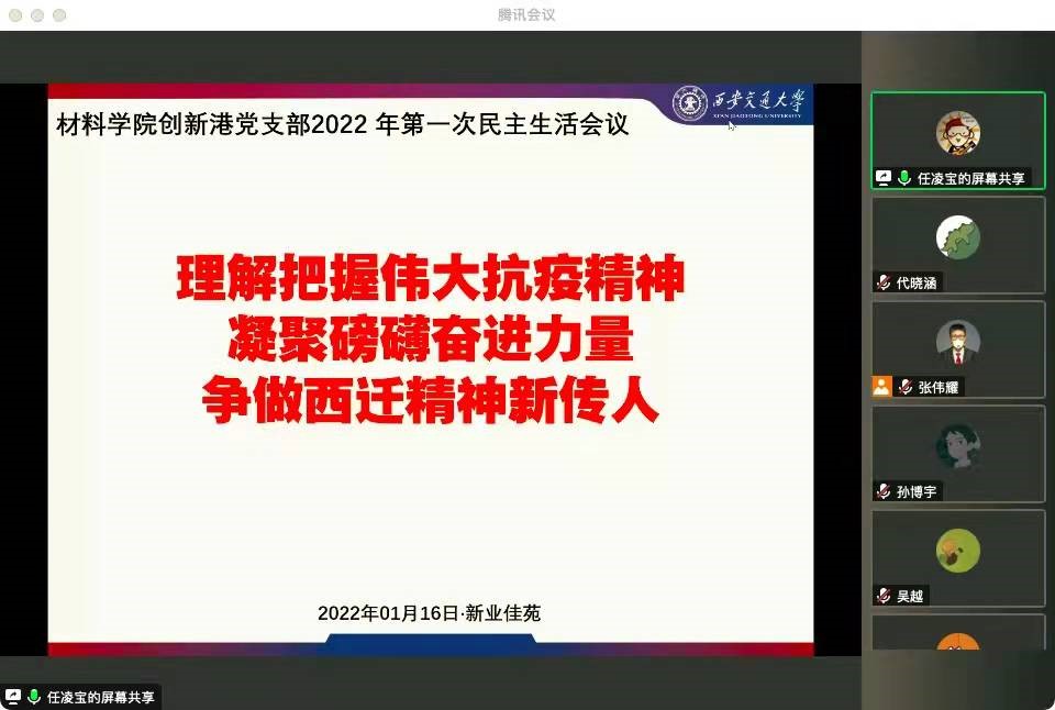 创新港党支部于2022年1月16日召开了“理解把握伟大抗精神、凝聚磅礴奋进力量争做西迁精神新传人”为主题的线上组织生活会议。会议由支部书记张伟耀同志主持,创新港党支部成员悉数参加。博彩注册送彩金网站