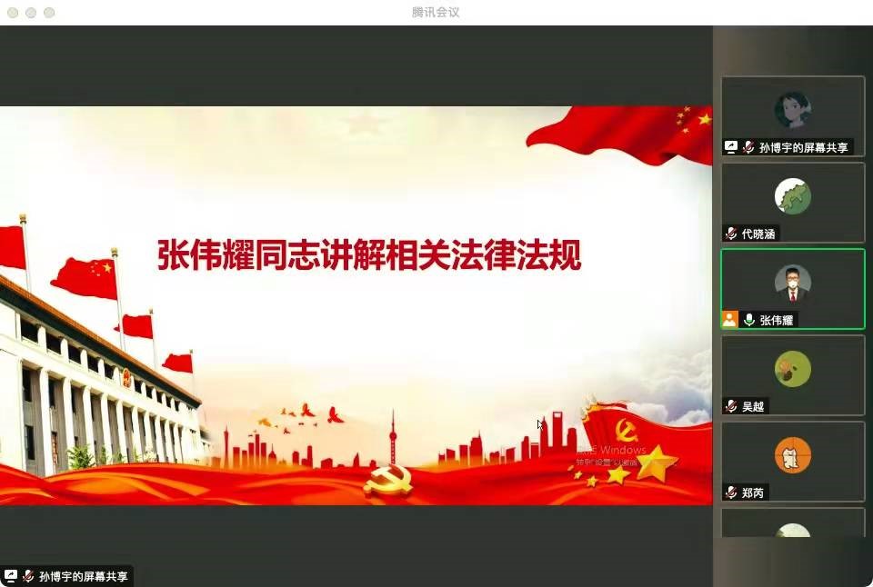 之后,支部书记张伟耀同志带领大家学习相关法律法规。他着重介绍了网络安全法的实施背景、意义和青年大学生应该如何践行;隐私权的定义、内涵、侵权行为和当前疫情条件下涉及隐私权的案例辨析;同时讲述了疫情期间学校、注册送彩金