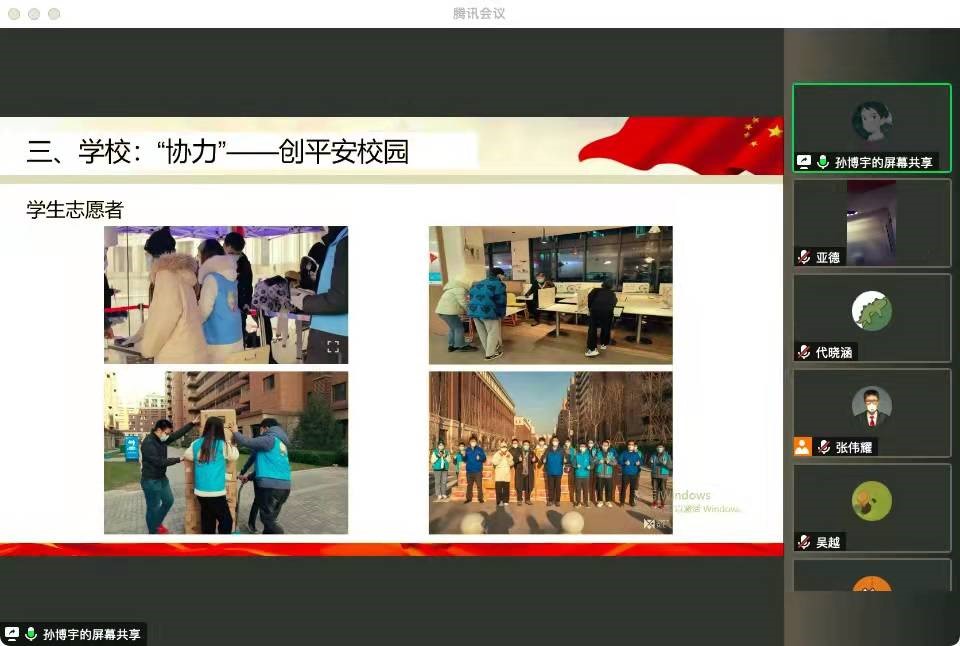 而后支部宣传组织委员孙博宇同志从政府:“封城”——护一方平安、社会;“齐心”——风雨共同舟、学校;“协力”——创平安校园三个方面向大家分享并一同学习了疫情期间社会各界所展现的、政府群众的伟大抗疫精神。不仅向大家传达了疫情期间社会各界的辛勤付出,也尤其表达了对疫情防控人员、医护人员的敬佩与感激,对志愿者们的感谢,并呼吁大家配合工作。