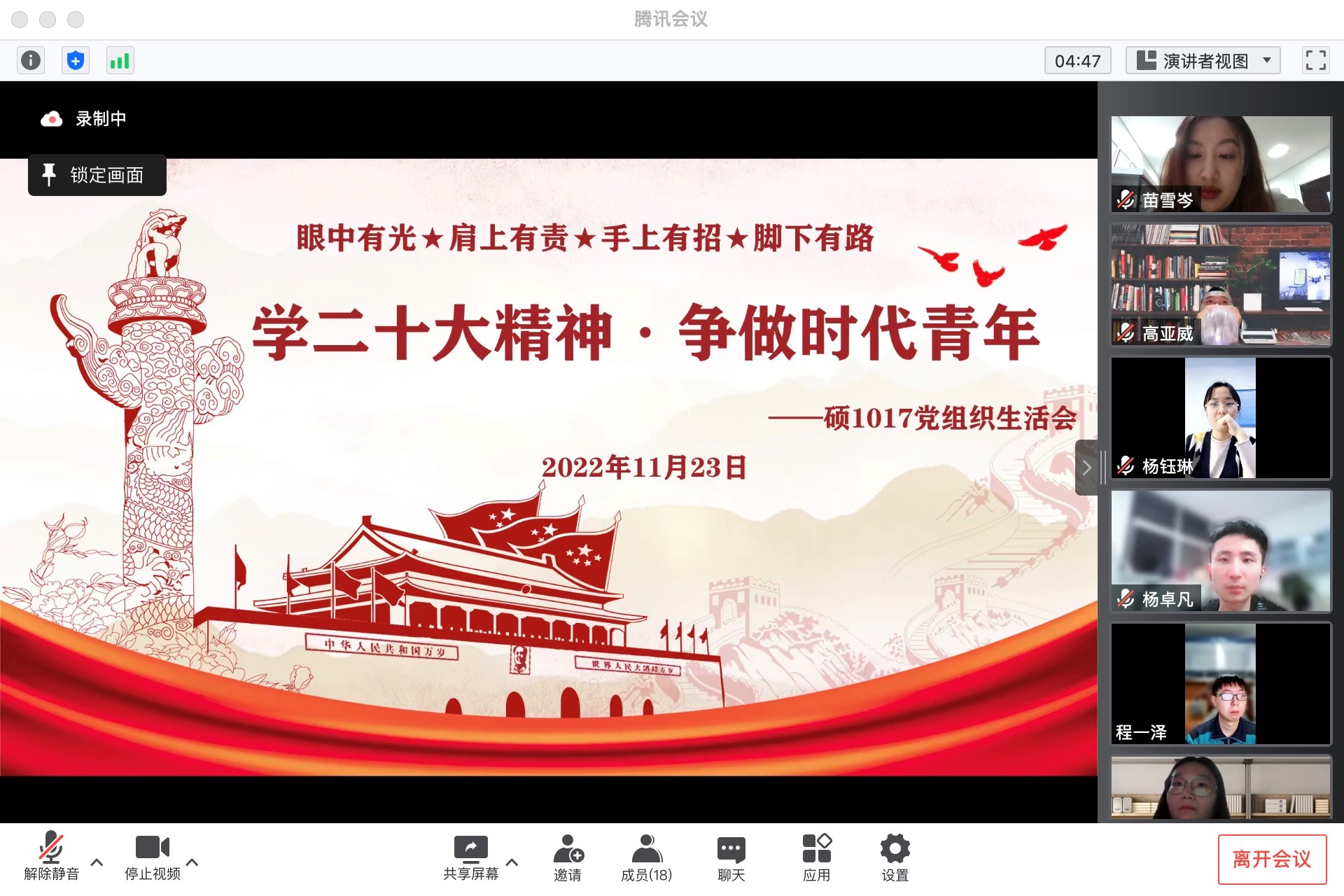 为深入学习党的二十大精神,领悟习近平新时代中国特色社会主义思想,提高支部成员党性修养,11月23日19:30,硕1017党支部在腾讯会议开展了以“学二十大精神,争做时代青年”为主题的组织生活会。博彩注册送彩金网站