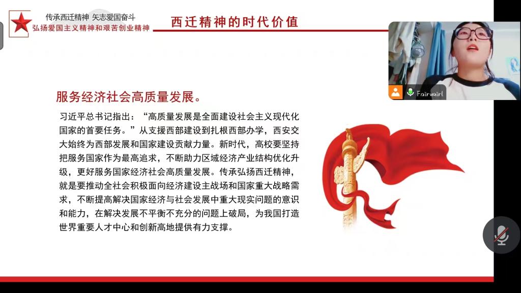 刘畅同学带领支部成员们学习了西迁精神的精髓与核心,并通过生动的案例,讲述了西迁前辈为国家和民族发展所作出的贡献,鼓励支部成员们将西迁精神融入自己的学习和生活中。