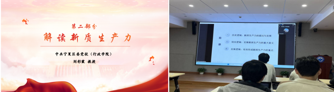 活动第三项,解读新质生产力。本次党课邀请了中共宁夏区委党校刘彩霞教授开展“新质生产力”的专题报告。她从历史逻辑:新质生产力的提出与发展、现实逻辑:发展新质生产力的重大意义、发展逻辑:培育形成新质生产力的重点三个方面为大家详细解读了新质生产力的“前世今生”。刘教授表示,加快高水平的科技自立自强可为新质生产力提供源源不断迭代更新的动力,期待每位同志投入到颠覆性科技创新、原创性科技创新、打赢关键核心技术攻坚战中。最后,刘教授以人民日报的一句话作为结尾,“苏子有言,‘盖将自其变者而观之,则天地曾不能以一瞬’,在这个时代,想成为弄潮好手,需在变化中抓住时机用于创新,完善自我”,给予研究生们殷切期盼。