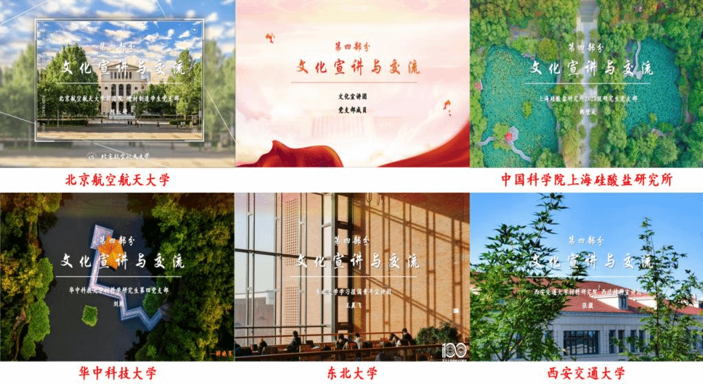 上海硅酸盐研究所韩壁成同志分享了上硅所的建所史和现有研究方向。西安交通大学张微同志宣讲了西安交通大学的“西迁精神”。东北大学王晨飞同志带领大家学习了“学习贯彻习近平总书记给东北大学全体师生的重要回信精神”。华中科技大学材料学研究生第四党支部刘腾同志分享了身为材料学子投身于国家建设的重要性。