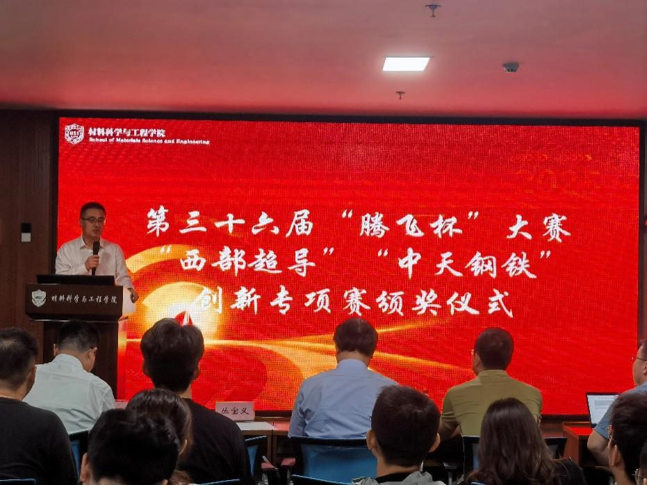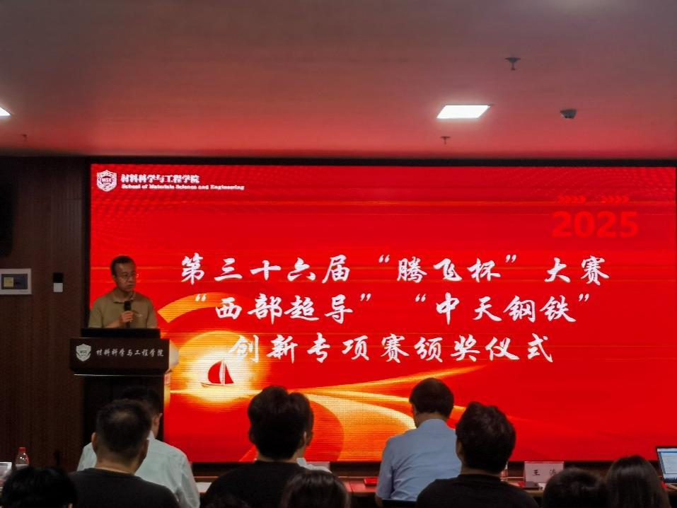 院长丁向东作总结致辞。他向两个赛道的获奖团队表示热烈祝贺,并向鼎力支持赛事的西部超导和中天钢铁两家企业致以衷心感谢。丁院长充分肯定了两项“腾飞杯”企业创新专项赛在激发学生创新潜能、促进产学研融合方面的重要作用,希望广大青年学子发扬创新精神,将竞赛成果转化为服务国家重大战略和产业发展的实际贡献。