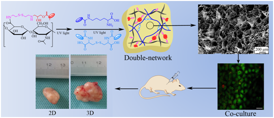 传统的二维细胞培养不能准确反映细胞在体内三维环境下的真实状况。本文作者利用连续光交联法制备出了具有双网络结构的聚(Nɛ-丙烯酰胺化赖氨酸)/透明质酸复合水凝胶,并将该水凝胶应用于构建乳腺肿瘤模型。研究发现该水凝胶具有高度多孔的双网络微观结构,可控的力学性能、溶胀和降解行为。体内外生物学实验表明,该水凝胶能促进乳腺癌细胞的粘附与增殖,诱导细胞形态多样化,促血管生长因子过表达,增强其侵袭与迁移能力。体内生物学性能评价证实,相对于2D培养,3D培养的肿瘤细胞体内致瘤能力更强。这些结果表明该水凝胶能有效仿生乳腺三维环境,为乳腺癌细胞提供一个生理相关的生长环境。该工作对肿瘤发生发展机制研究和抗癌药物筛选具有重要的参考价值。