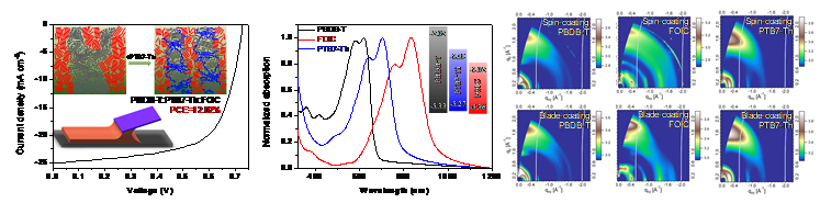 得益于非富勒烯受体的快速发展,单节有机太阳能电池的光电转换效率(PCE)已经达到14%。然而,这些成绩都是基于实验室小面积旋涂成膜(spin-coating)而获得的。为了今后广泛应用有机太阳能电池,发展大面积加工技术极为迫切。狭缝挤出成膜(slot-die coating)是一种可结合卷对卷的连续加工技术,是未来大面积加工有机太阳能电池的成膜技术。而刮涂成膜(blade-coating)是狭缝挤出成膜的一种原型工具,具有类似的特征,并且刮涂可以对分子施加更强的剪切力,增强分子排列及聚集,起到诱导结晶的作用。另外,三元是一种获得高性能的有效策略,添加的第三组分不仅可以提高光电流,还可以调控给受体结晶性并优化活性层形貌,进而获得高的光电性能。但是,在有机太阳能电池领域,通过刮涂和三元策略协同调控活性层形貌的相关研究还没有报道。