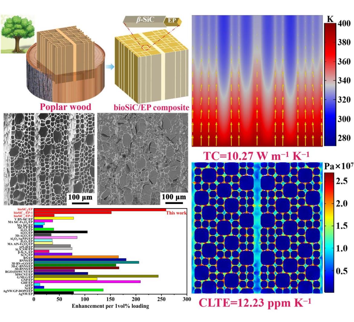 受贝壳珍珠母“砖-泥”层状结构启发,西安交通大学研究人员提出了一种基于木材多尺度结构基元序构的仿生设计思路,采用生物模板陶瓷化技术结合真空浸渍法,在环氧树脂基体中构建了具有各向异性的碳化硅导热框架,该3D框架不仅具有轴向的高度定向排列性,且其内部相邻的纳米SiC晶粒紧密接触,界面热阻低;另一方面,该框架在径向具有限制高分子链热运动的蜂窝网络结构。借助SiC高热导的属性和仿生结构的特点,复合材料在实现轴向热导率有效提升的同时(热导率为传统SiC颗粒弥散分布复合材料的20倍,导热增强效率高达259),获得了极低的径向热膨胀系数以及优异的热稳定性和阻燃性能。
