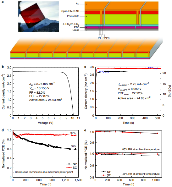 钙钛矿太阳电池历经10年发展达到了25.7%的认证效率,已媲美于商业化晶硅电池。但大组件效率与小尺寸电池依然有差距。近期,瑞士洛桑联邦理工大学、华北电力大学与西安交通大学等十余家单位组成的研究团队,设计菱形单晶TiO2电荷传输层和抽气法制备大面积钙钛矿薄膜,论文《基于单晶TiO2纳米颗粒的高效稳定钙钛矿太阳电池组件》(Single-crystalline TiO2 nanoparticles for stable and efficient perovskite modules)于2022年4月22日在《自然纳米技术》(Nature Nanotechnology)上在线发表。