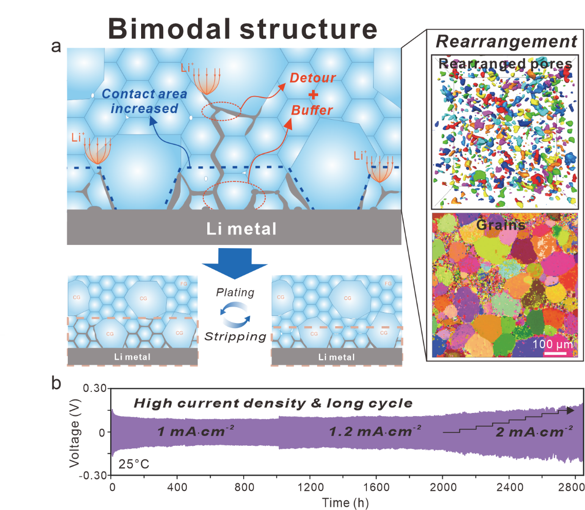图1 (a) 晶粒双峰分布的固态电解质对锂枝晶生长产生“迂回与缓冲”效应,(b) 可在电流密度高于1 mA·cm-2的条件下稳定循环2000小时以上,并可在电流密度为2 mA·cm-2的条件下成功循环100小时以上
