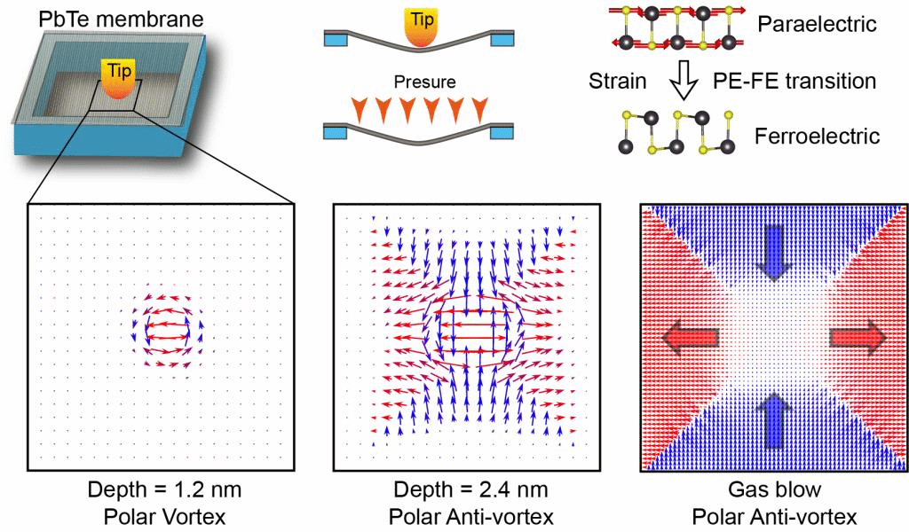 的刘益伦教授和墨尔本大学的刘哲教授通力合作,通过多尺度模拟方法,将铁电极化拓扑结构及其调控拓展到二维铁电材料中。首先,研究团队利用第一性原理计算,发现二维PbX(X = S,Se,Te)材料可通过应变诱发“顺电-铁电”相变,并确定了材料的“应变-极化”相图;随后,基于二维PbX材料具有优异的面外屈曲变形的特点,研究团队采用基于深度学习势的大规模分子动力学,模拟“纳米压痕”实验,发现二维PbX材料在复杂应变场条件下可诱发“类斯格明子”的极化涡旋拓扑结构;最后,利用有限元模拟,通过设计不同几何压头的纳米压痕或压力鼓泡等机械载荷导致的复杂应变场,在二维PbX材料中实现了可回复的极性涡旋、反涡旋和通量闭合畴等多种二维曲面铁电极化拓扑结构。研究工作证明了利用复杂应变场,可在柔性二维铁电材料中,设计各种可逆的极化拓扑结构,有望为开发基于新型二维铁电材料的高密度存储器和传感器等功能器件提供新的思路。