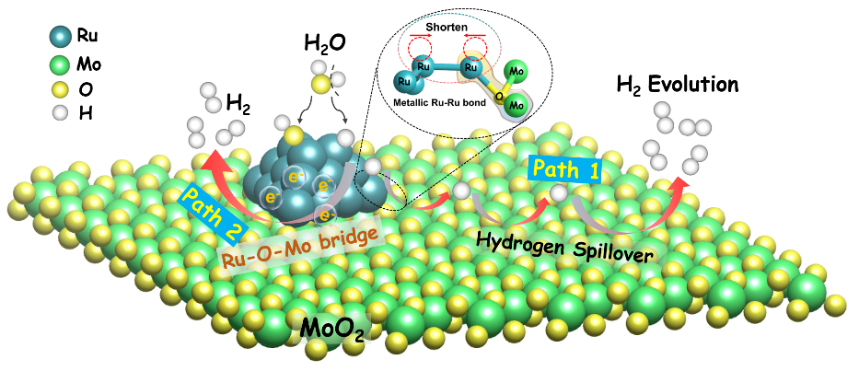 针对负载金属缺电子态与HER催化的理论实验矛盾问题,科研人员除了关注界面处的物理化学特性,创新性的考察了负载金属位点本身键合特性对催化性能之间的影响调控行为,探究了载体表面Ru-Ru金属键特性对界面电子结构-HER性能的影响;进一步,通过静电纺丝法和高温碳化处理成功制备了Ru/MoO2复合模型催化剂,通过同步辐射光谱表征了所形成Ru/MoO2异质结构,发现载体表面Ru-Ru键长发生缩短,使得Ru-Ru金属键得到强化,进而增强了金属键对自由电子的束缚能力,能够有利于吸附带正电的质子,且其界面Ru-O-Mo键桥能够有效触发氢溢流,因而在金属颗粒表面与负载界面处协同促进HER催化过程。因此,Ru/MoO2催化剂在全pH范围内均展现出了优异的HER析氢活性与动力学,碱性下过电位仅为9.2 mV(@10 mA cm-2)。研究成果以《强化载体Ru金属键促进界面氢溢流用于全pH析氢反应》(Intensifying the Supported Ruthenium Metallic Bond to Boost the Interfacial Hydrogen Spillover Toward pH-Universal Hydrogen Evolution Catalysis)为题在《先进功能材料》(Advanced Functional Materials)在线发表。