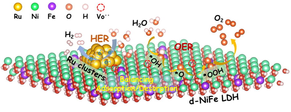 金属位点价电子结构对其得失电子性与催化活性具有至关重要的决定作用:低价位点因其更高的给电子能够可适配HER(得电子)反应;同理,高价位点能更有效的驱动OER过程。然而,金属-载体界面键合电子转移后,金属价电子排布逐渐趋于稳态,导致电子受/给特性以及HER/OER双功能难耦合。针对这一难题,科研人员发展了界面缺陷诱导金属3d电子结构亚稳态的新途径,将Ru纳米团簇锚定在含有氧缺陷的NiFe氢氧化物(LDH)纳米片上,路易斯酸性的氧空位驱动了Ru→载体的电子再转移,诱发形成的亚稳Ru2.2+位点介于Ru2+(4s13d5)与Ru3+(4s03d5)两稳态之间,耦合了电子给/受特性与HER-OER双功能,实现了大幅优于商业催化剂的全解水电位(1.49 V@10mA/cm2)与稳定性,贵金属载量(~2 wt% Ru)仅为商业催化剂的1/10。创新成果为HER-OER双功能催化材料的有效构建,提供了非平衡亚稳局域电子态金属位点的设计方法学参考。研究成果以《界面氧空位亚稳化钌纳米团簇用于全分解水》(Metastabilizing the Ruthenium Clusters by Interfacial Oxygen Vacancies for Boosted Water Splitting Electrocatalysis)为题在《先进能源材料》(Advanced Energy Materials)在线发表。