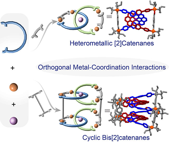 张明明教授课题组利用Cu/菲罗啉单元与Pt/吡啶/羧酸的正交自组装,高效制备了一系列双金属核[2]索烃和环状双[2]索烃,其结构得到了单晶X射线衍射的验证。该工作首次报道了由正交金属配位自组装制备的刚性环状双[2]索烃,为利用索烃来构筑高阶机械互锁结构提供了新的思路。之后作者发现这类结构具有广谱的抗菌性能,为高阶超分子结构在生物医学领域的应用提供了借鉴。近日,该研究成果以《基于正交金属配位作用的异核双金属[2]索烃和环状双[2]索烃的高效自组装》(Highly Efficient Self-Assembly of Heterometallic [2]Catenanes and Cyclic Bis[2]catenanes via Orthogonal Metal-Coordination Interactions)为题发表在国际化学领域权威期刊《德国应用化学》(Angewandte Chemie International Edition)上。该论文的第一作者为西安交大博彩注册送彩金网站