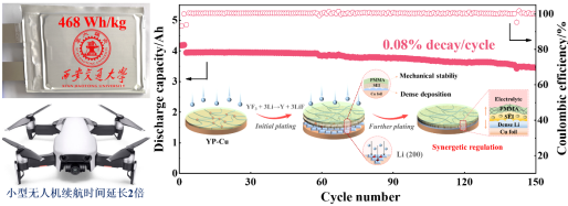 针对上述挑战,西安交通大学宋江选教授团队提出了一种固体电解质中间相力学和锂晶体学协同调控新方法,通过使用氟化钇/甲基丙烯酸甲酯复合层解决了锂金属负极界面稳定性差的难题。研究人员通过复合层与锂金属的原位反应生成Y掺杂锂金属,诱导锂沉积过程中的晶体学优先取向从传统的(110)晶面转变为(200)晶面,促使锂金属与电解液之间的副反应降低了80%。同时,所采用的活性聚合物复合层兼顾锂离子传输能力和良好的力学性能,可显著改善界面层的离子电导率和机械稳定性。基于上述策略所制备的4.2 Ah大容量软包电池能量密度高达468 Wh kg-1,显著提升了小型无人机的续航时间;且在高面容量正极(6 mAh cm-2)、贫电解液(1.98 g Ah-1)和高电流密度(3 mA cm-2)的苛刻条件下展现出优异的循环稳定性,单圈容量衰减率仅为0.08%。本研究为高比能锂金属电池的开发提供了新的思路。相关研究成果发表在国际知名期刊Nature Communications上,注册送彩金-博彩注册送彩金网站