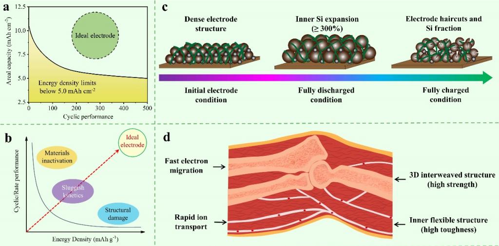 针对上述问题,宋江选教授团队提出高比能二次电池仿生设计策略,构建了兼具“高强韧-快导锂”的仿贝壳结构硅电极,设计了仿神经网络功能粘合剂,解决了硅电极因大体积膨胀/收缩引发的离子输运失效与结构崩塌问题,揭示力-电多物理场下高比容合金负极稳定化机制,为实用化硅负极提供了理论支撑。相关成果分别以《仿神经网络粘合剂助力高比容硅负极离子输运和应力释放》(Neural Network Inspired Binder Enables Fast Li-Ion Transport and High Stress Adaptation for Si Anode)为题发表在国际知名期刊《纳米快报》(Nano Letters),以《仿生贝壳结构提升高面容量硅碳负极强韧性》(Biomimetics-Inspired Architecture Enables the Strength–Toughness of Ultrahigh-Loading Silicon Electrode)为题发表国际知名期刊《先进功能材料》(Advanced Functional Materials)。