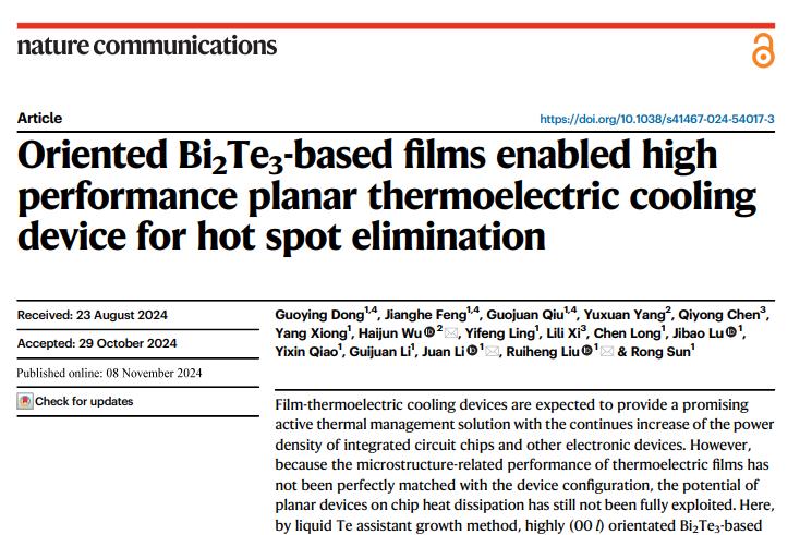 深圳先进技术研究院团队合作,在权威刊物《Nature Communications》(《自然通讯》)在线发表研究论文“Oriented Bi2Te3-based films enabled high performance planar thermoelectric cooling device for hot spot elimination”(“高取向碲化铋薄膜赋能面内热电器件用于芯片热点散热”)。西安交通大学博彩注册送彩金网站