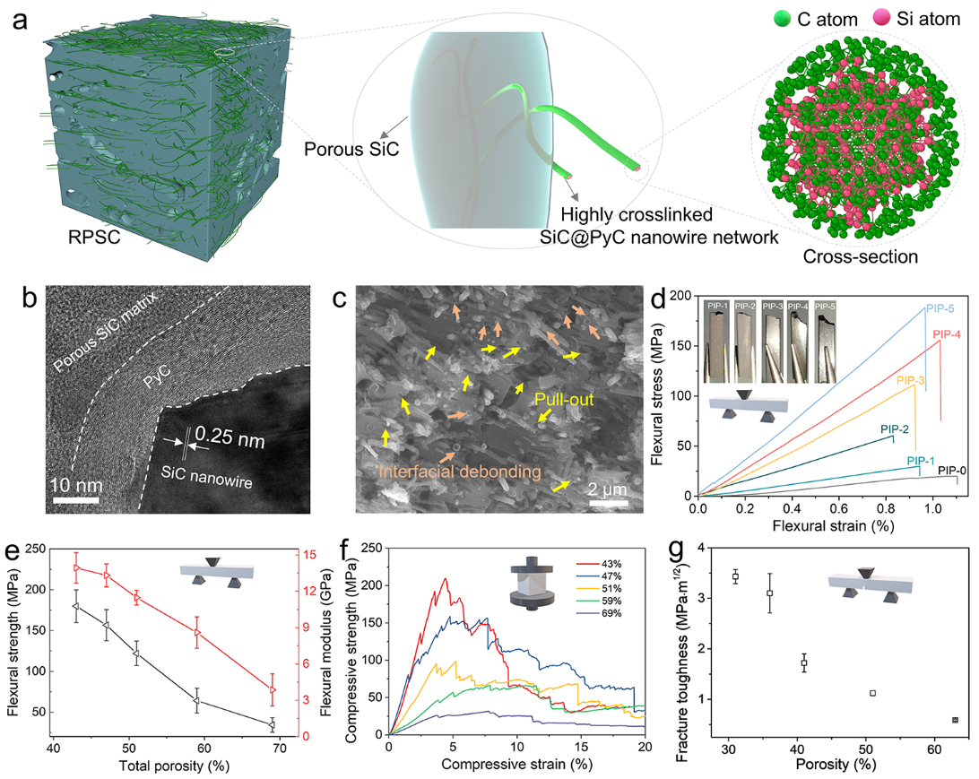 SiC多孔陶瓷因其低密度、优异的耐高温、抗腐蚀及耐氧化等特点,在高温隔热、腐蚀性气体过滤和高温轻质结构件等领域有着独一无二的优势。然而,陶瓷材料天然的脆性问题,且大量的气孔通常作为裂纹萌生位点,使得多孔SiC陶瓷在高气孔率条件下往往面临着强度低、脆性大、可靠性差的困境,严重制约了其实际应用。
