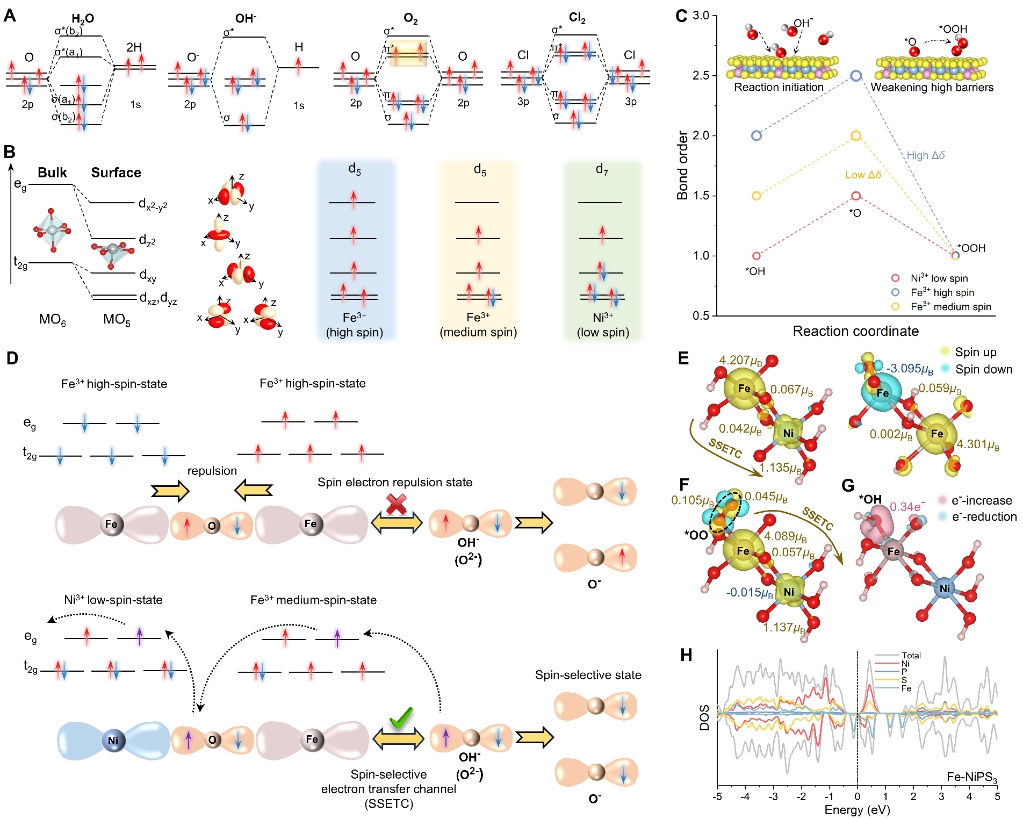 近日,西安交通大学科研人员提出了通过非对称Fe-Ni立构策略以实现原子级局域自旋调控的新机制。将Fe引入NiPS3晶格后引起自旋态重新分布,形成具有中自旋态(MS)的Fe3+活性位点。通过P/S配位进一步稳定Fe3+的MS态,并凭借自牺牲抑制竞争性的Cl⁻氧化反应及Cl⁻毒化。该催化剂在碱性及真实海水电解中均展现出优异性能,在10 mA cm⁻2条件下的工作电压仅为1.50 V/1.52 V,并能保持1000小时稳定运行。此外,该催化剂在阴离子交换膜(海)水电解槽(AEM(S)WE)器件中也表现出稳定低压的工作优势。此外,通过理论计算、X射线吸收谱、电子顺磁共振、穆斯堡尔谱等多维度技术手段,系统地揭示了MS Fe3+在促进自旋选择性电子转移中的关键作用。本研究为非贵金属催化体系中构建内在自旋调控路径提供了新范式,对绿色高效制氢催化剂设计具有重要参考意义。