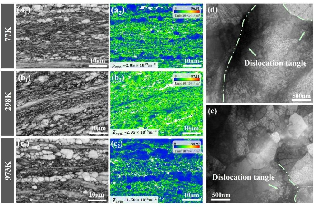 基于这一理念,西安交通大学金属材料强度全国重点实验室材料创新与设计中心(CAID)丁俊教授、马恩教授团队设计出一种可冷加工的Nb–Ta–Ti–Hf基难熔高熵合金(成分:Nb₄₃.₂Ta₂₇Ti₁₃Hf₁₅Re₁.₅B₀.₃)。研究人员采用冷轧+退火的热机械处理工艺,成功构筑出一种热稳定的异质晶粒结构,由纳米级超细晶、细晶和残余变形晶协同组成,形成力学性能梯度(图1)。实验结果显示,该合金在77 K低温下抗拉强度超过1.8 GPa,延展率保持在约10%;在973 K高温下仍能维持超过900 MPa的抗拉强度,刷新了单相固溶体类合金的纪录。进一步的原位力学和显微分析揭示,这种优异性能源于HDI强化机制:在软硬区域的变形过程中发生应变分配与位错累积,在界面处形成反向与正向内应力,显著提升了加工硬化能力(图2)。值得强调的是,该机制不仅在室温和低温下有效,而且在高温条件下依然能够持续发挥作用。