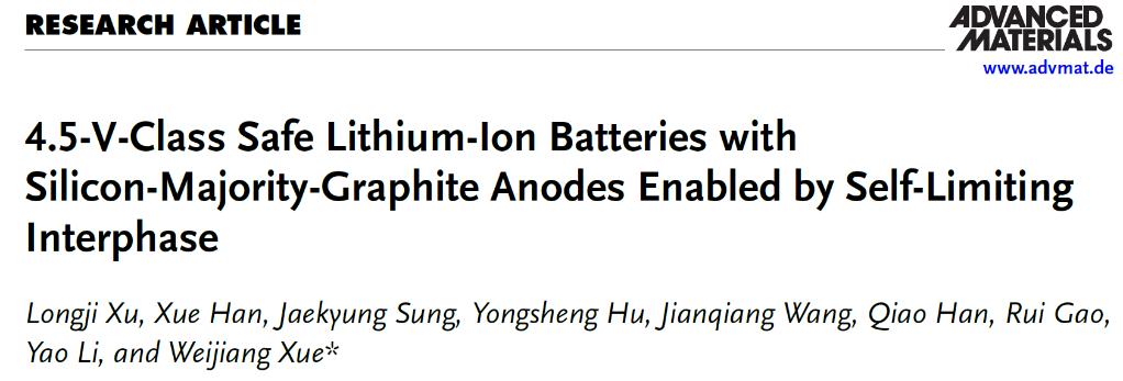 以上工作成果以《自限性界面赋能4.5 V级高硅负极高安全锂离子电池》(“4.5-V-class safe lithium-ion batteries with silicon-majority-graphite anodes enabled by self-limiting interphase”)为题,发表于国际权威杂志《先进材料》(Advanced Materials)。西安交通大学金属材料强度全国重点实验室为论文第一通讯单位,本论文由西安交通大学材料科学与工程注册送彩金