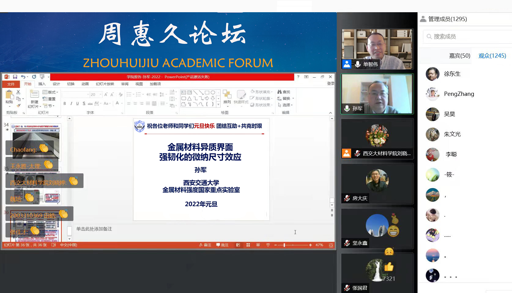 2022年1月1日,孙军院士做客周惠久论坛线上讲座,他以“金属材料异质界面强韧化的微纳尺寸效应”为题开启了新年第一讲。本次讲座由西安交大博彩注册送彩金网站